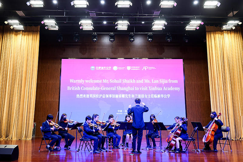 5月25日下午14:00時,英國商業(yè)貿(mào)易部公使銜參贊施睿耀先生、英國商業(yè)貿(mào)易部教育與技能司高級貿(mào)易投資官蘭思佳女士一行來訪,合肥市教育局辦公室張媛主任陪同,新華公學(xué)總校長秦新春、融合部校長溫晨瑋、行政副校長吳晶晶等校領(lǐng)導(dǎo)熱情接待。首先在報告廳舉行了簡單的歡迎儀式,新華國際青少年樂團(tuán)用精彩的表演對來訪嘉賓表示了熱烈的歡迎。