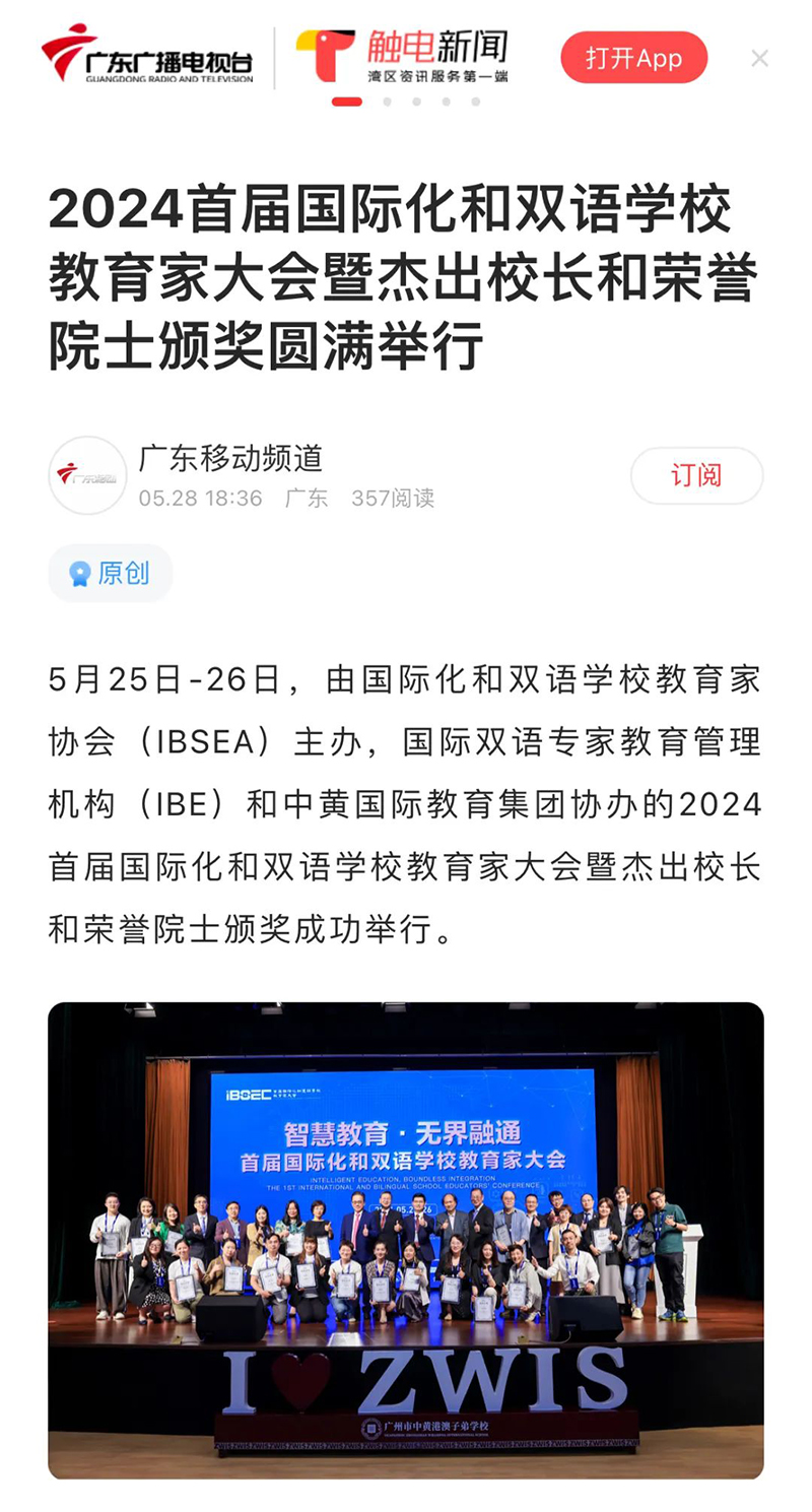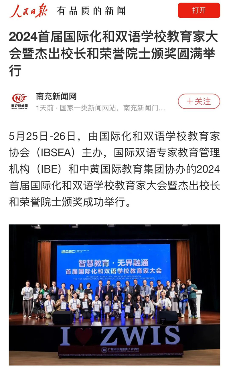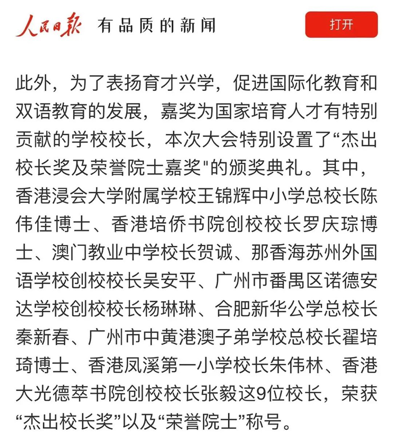 人民日報、廣東電視臺等多家主流媒體對大會進行了報道,重點聚焦在「首屆國際化和雙語學校教育家大會」為中國特色國際化教育從業者搭建了一個良性互動的平臺,為推動AI人工智能技術與國際化教育融合所做的嘗試,以及為了嘉獎有特別貢獻的學校校長而頒發的“杰出校長獎及榮譽院士嘉獎”。