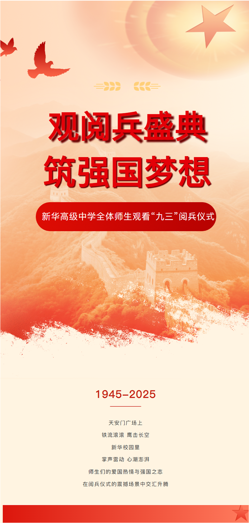 2025年9月3日上午,紀(jì)念中國(guó)人民抗日戰(zhàn)爭(zhēng)暨世界反法西斯戰(zhàn)爭(zhēng)勝利80周年大會(huì)在北京天安門廣場(chǎng)隆重舉行。為銘記歷史、緬懷先烈、珍愛和平、開創(chuàng)未來,激發(fā)全體師生的愛國(guó)熱情和民族自豪感,新華高級(jí)中學(xué)精心組織全體師生齊聚在報(bào)告廳、教室共同觀看了此次大會(huì)直播,感受偉大祖國(guó)的強(qiáng)盛與輝煌。