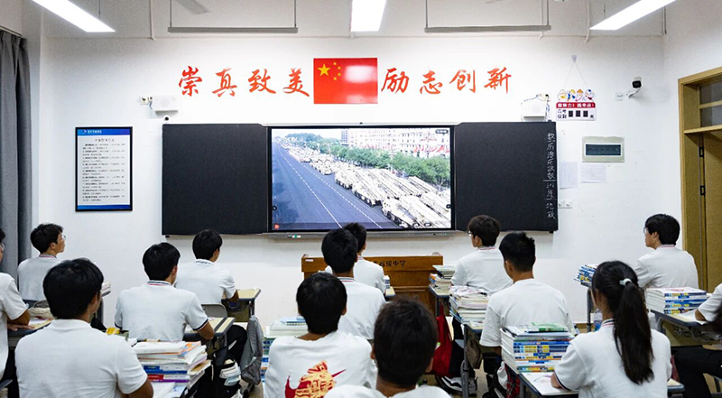 三軍將士,氣勢(shì)如虹盡顯軍威;鐵甲雄風(fēng),共和國(guó)鑄就鋼鐵壁壘;長(zhǎng)劍出鞘,巡航導(dǎo)彈驚艷全場(chǎng);雄鷹展翅,百余戰(zhàn)機(jī)劃破長(zhǎng)空;長(zhǎng)安街上,涌起滾滾奮進(jìn)潮。全體師生被閱兵式上整齊劃一的方陣、先進(jìn)精良的裝備、高昂飽滿的士氣所深深震撼,不時(shí)爆發(fā)出陣陣掌聲和歡呼聲。他們專注的神情和激動(dòng)的表情,展現(xiàn)出對(duì)祖國(guó)強(qiáng)大的自豪與驕傲。
